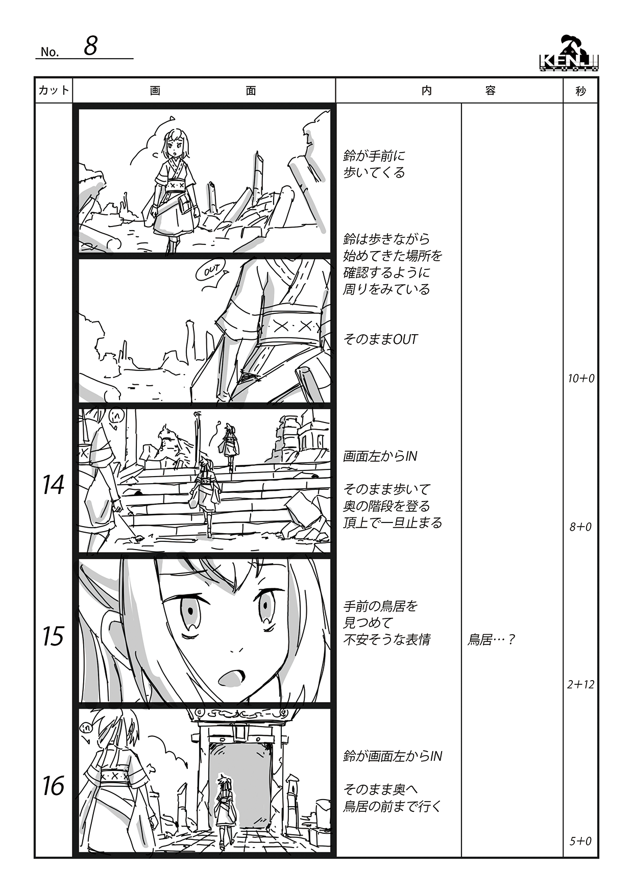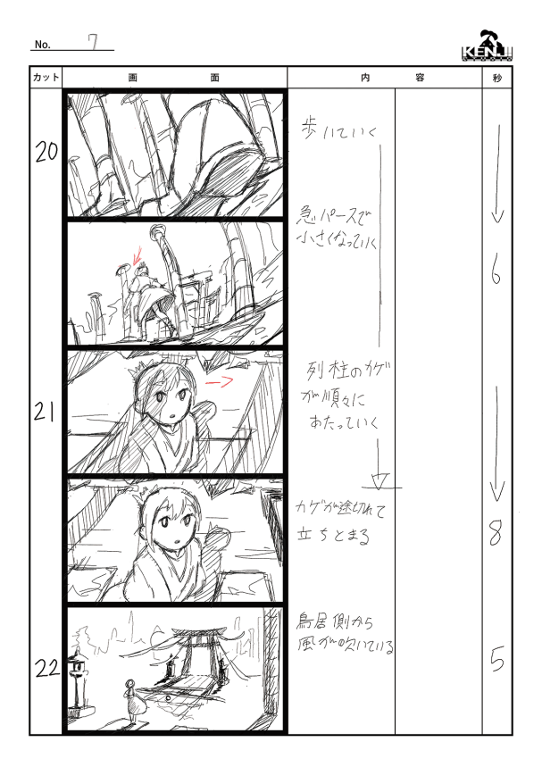 映像の設計図となる絵コンテをシナリオに合わせて自由な発想で作成する課題です。教員が同じ内容で絵コンテを作成し、正解の一例として配布しています。現役アニメ監督の教員からの講評だけでなく、教員が描いた実例コンテが提供され照らし合わせて学ぶことができます。