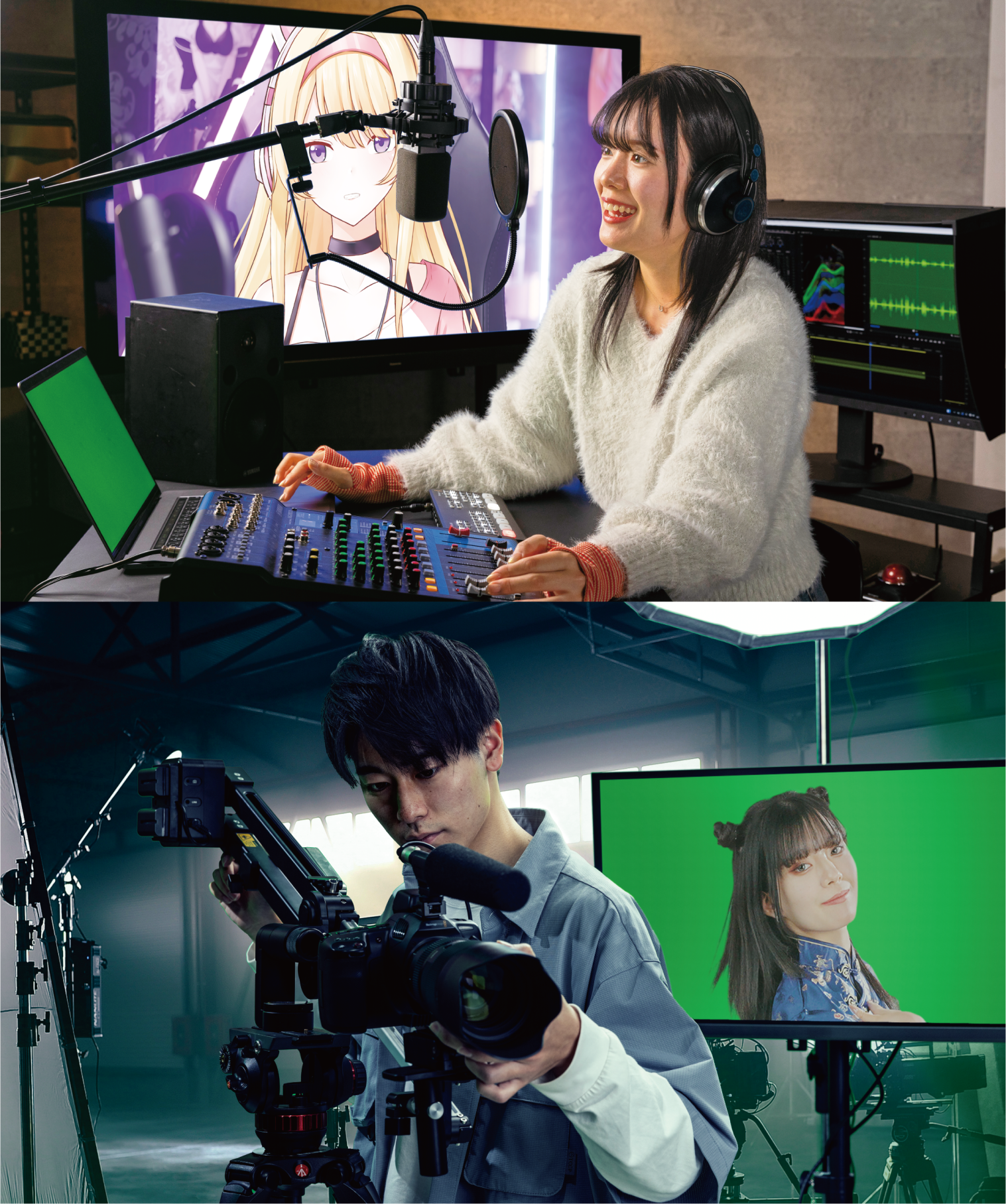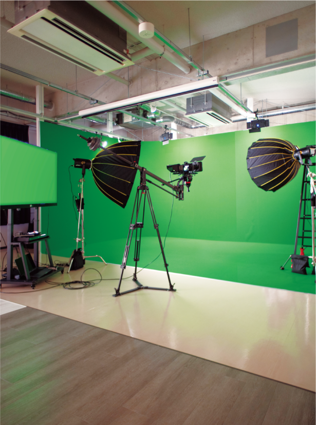 背景を合成するための撮影スペース。モーション・フェイシャルキャプチャーでVTuberの制作にも対応。