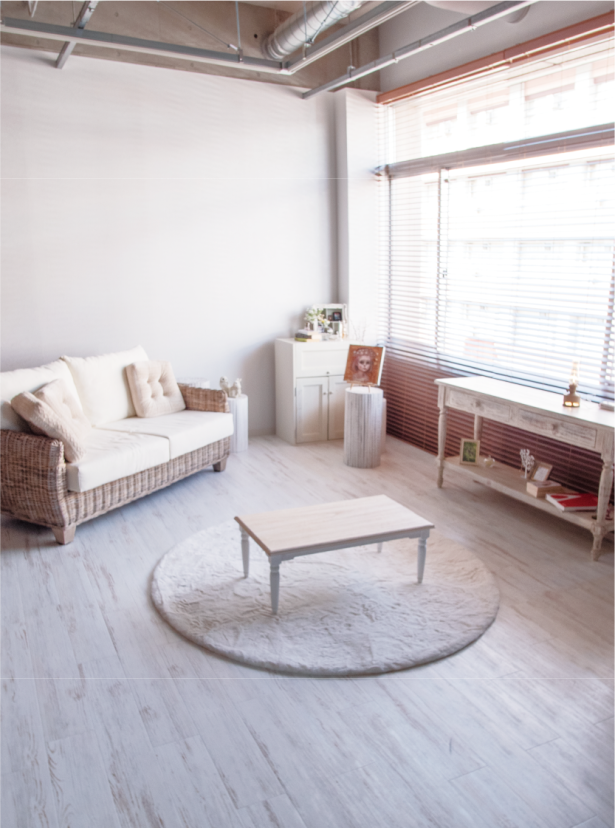 窓からの採光によるデイライト撮影スペース。住居のリビングなどを意識した家具で構成される。
