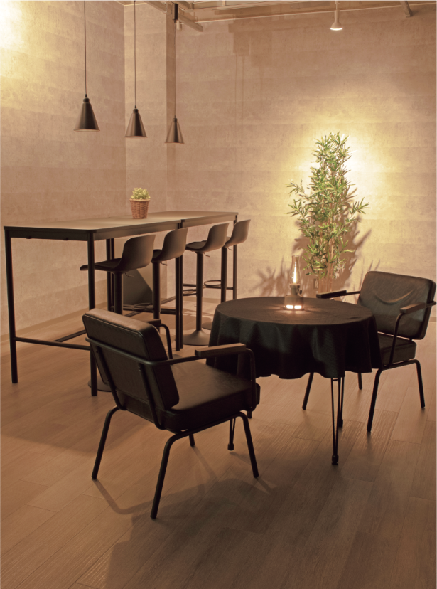 インドアのライティングを基本とする撮影スペース。カフェなどを意識した什器類で構成される。