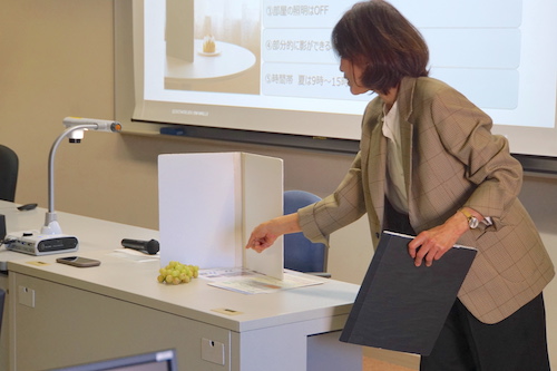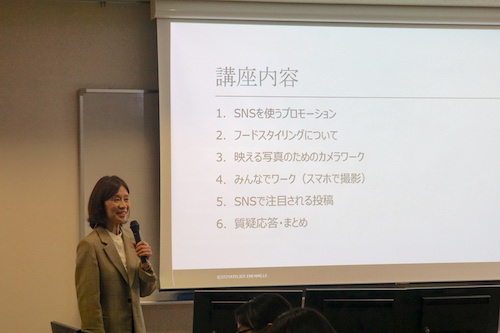 今回は「SNSで映えるフード写真テクニック」というテーマで中出氏よりお話をいただき、産学連携PBLの集大成として実施する新商品発表会に向け、商品写真の撮影方法やプロモーションのテクニックについて学修しました。