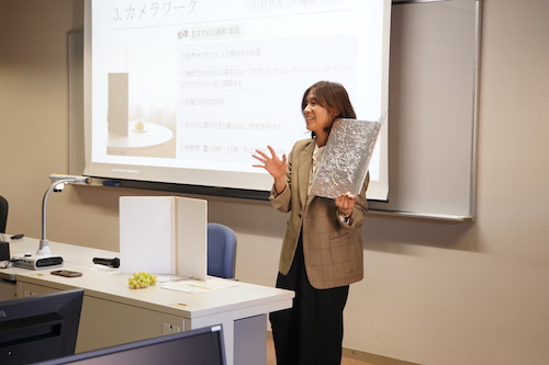 2025年10月29日(水)、経営学部 経営学科 食ビジネスコースでは、Atelier Enfamille(アトリエ・あんふぁみーゆ)テーブルフォトスタイリストの中出 真理子氏をお招きし、特別授業(食品開発実践:担当 髙畑 能久教授)を開講しました。