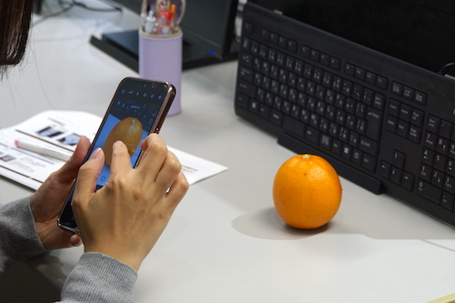 ▼学生全員に食品サンプル(果物)を配布し、教わったコツを活かしながら撮影しました。