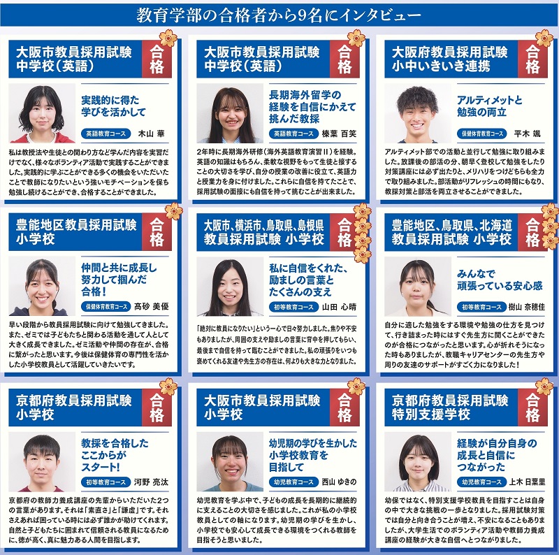 令和8年度公立学校教員採用試験を現役合格した教育学部の学生から代表して9名にインタビューを行いました。