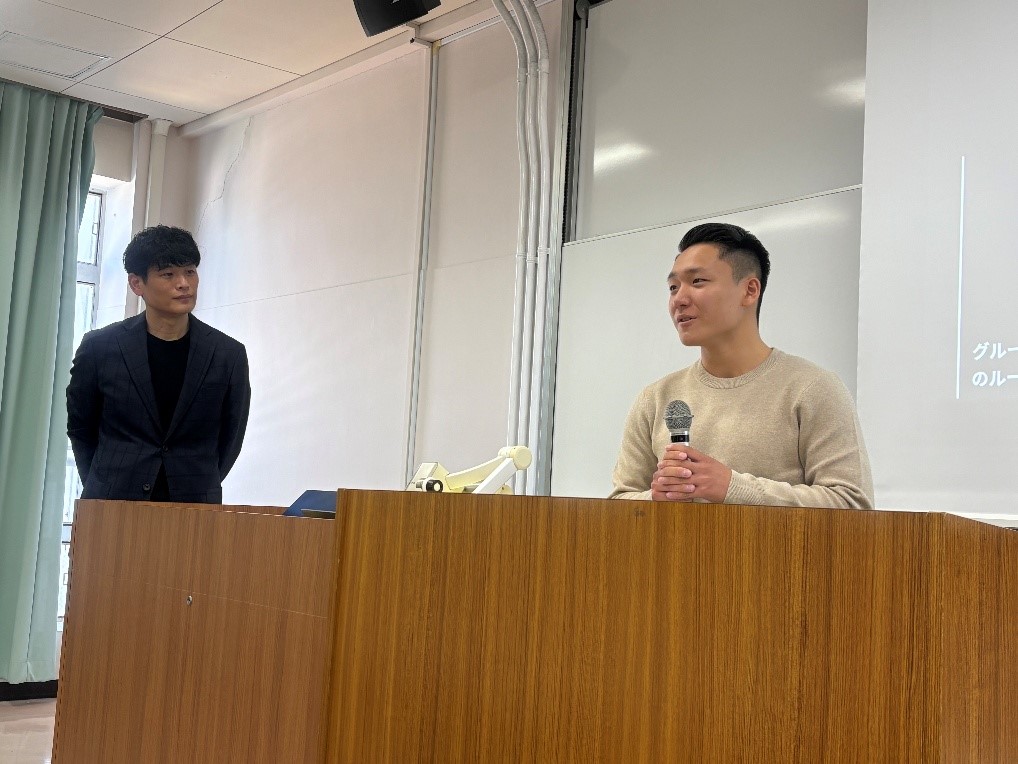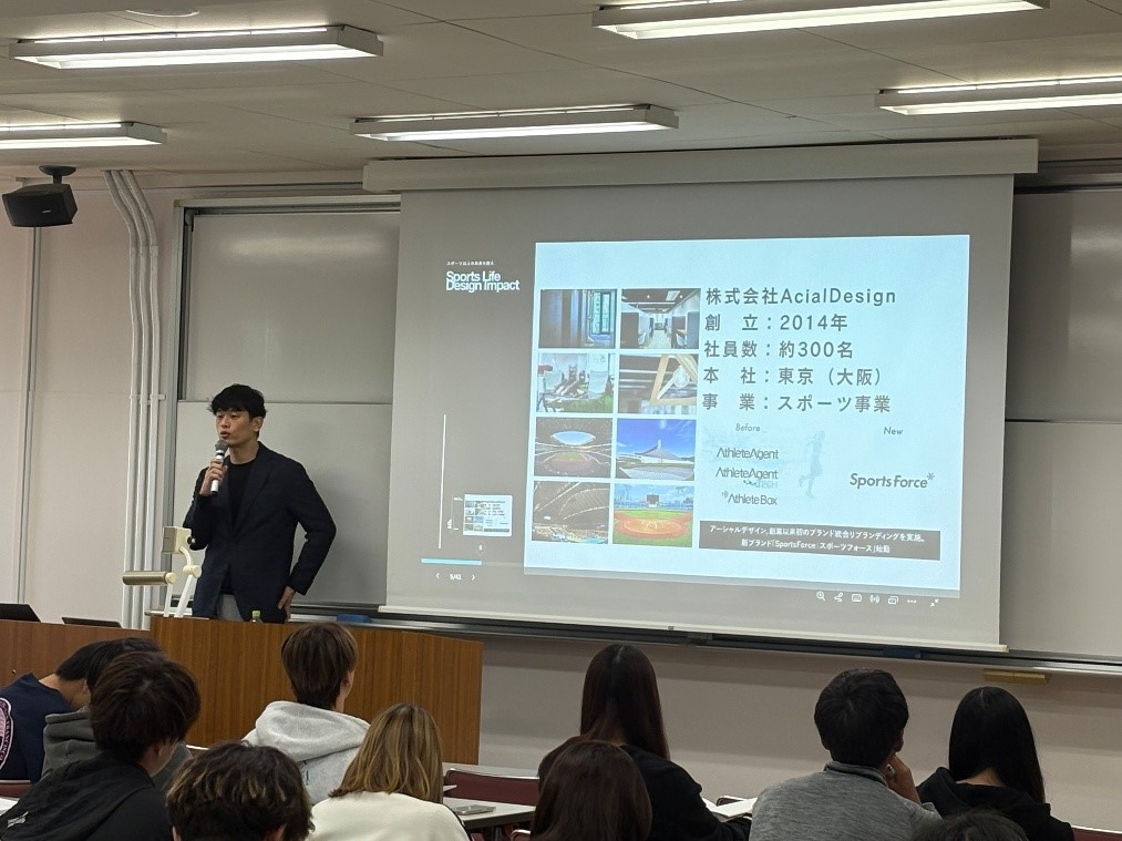 2025年10月30日(木)、スポーツマネジメント学科は、「仕事とキャリア演習」(主に2年生)および「仕事とキャリア」(主に3年生)受講生を対象に、株式会社アーシャルデザインの東 俊介氏、佐久間 隆弥氏にお越しいただき、特別講義を実施しました。