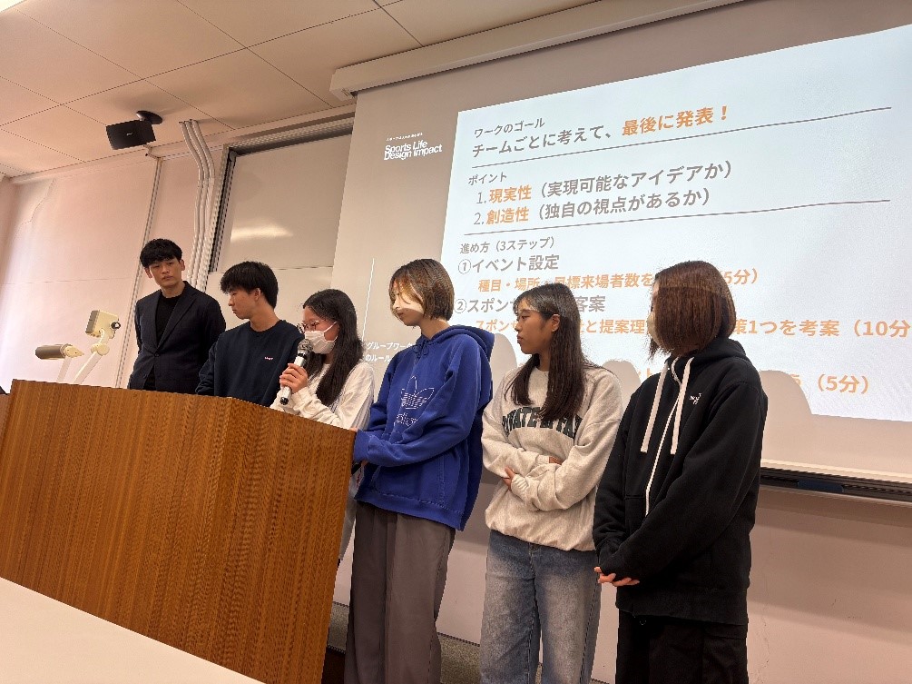 特別講義では、東氏のこれまでのご経験を踏まえながら、「スポーツマネジメント現場におけるキャリアの選択肢を具体的にイメージする」、「マネタイズ思考と現場で活用できるスキルの意識づけ」を授業目標として、働く目的・意義を問う「3人のレンガ職人」のお話やスポーツビジネス現場の実際などをレクチャーいただきました。その後、実践的グループワークとしてビジネスアイデア企画・発表実践を行い、「相手に自分を理解してもらうためには、明確な自己表現を」など熱いメッセージをいただきました。