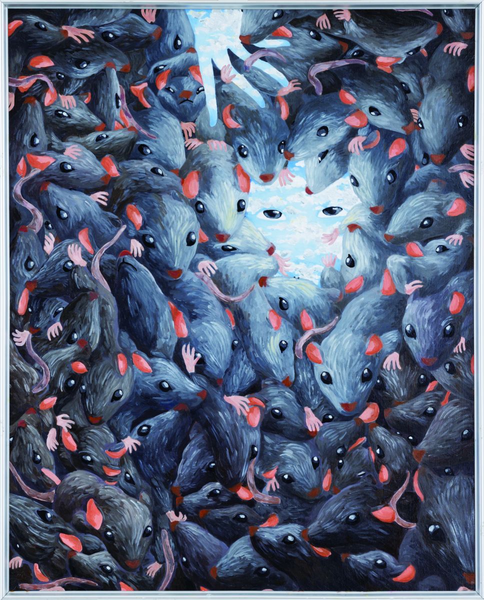 大胆に配したモチーフ、筆致の細やかさ、背景に使用したコーヒーとともに中間色の見事な彩色など、情報の過不足がなくとても魅力的な作品です。生き物には温かさがあって、ピンが刺さって見えるところからすると、女の子が身を包む着ぐるみなのかもしれません。安心する居場所や時間、優しい誰かとが自分をかたちづくる。そんな物語のある作品の描き手として今後が楽しみです。
