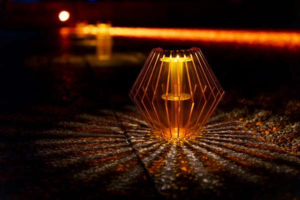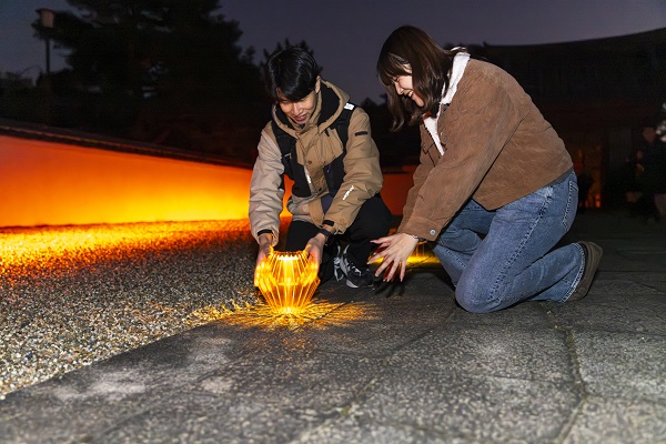 ソーラーバッテリーによって充電されたライトが夜間に点灯し、学生が施したデザインが浮かび上がる仕組みになっています。行燈の光には、会場全体の演出カラーであるアンバーを採用。萬福寺境内の暗がりに配置されます。