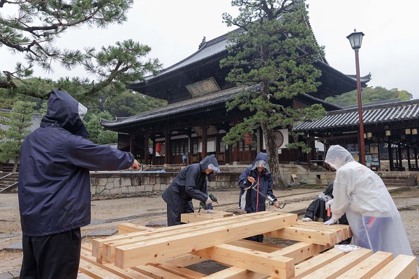 当日の奉納式には、黄檗山萬福寺 宗務総長・荒木將旭氏も参加され、学生の手によって境内各所へ行燈が奉納されました。