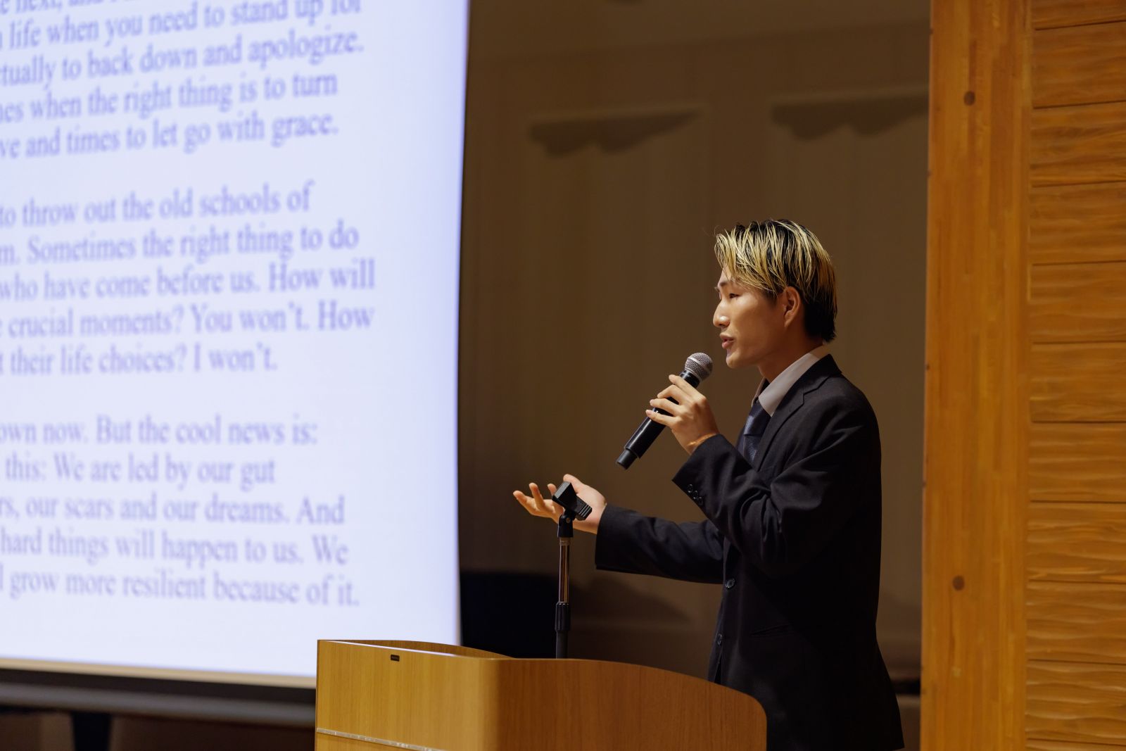 世界的に有名なスピーチの中から1つを選択し、2分の発表時間内で暗唱。国際観光学部1年生と教育学部 英語教育コース1年生向けに募集を行い、4名の学生が選出され出場しました。