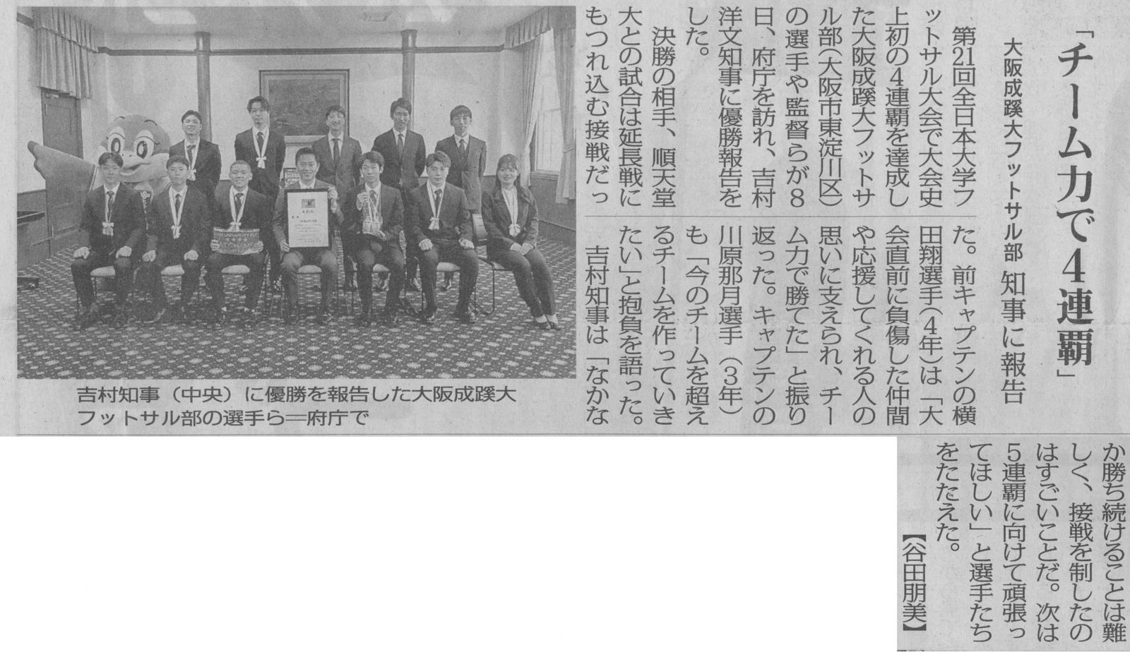 フットサル部の吉村大阪府知事への表敬訪問が、12月9日付毎日新聞で掲載されました。