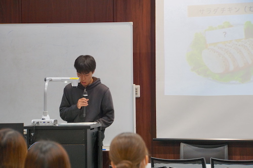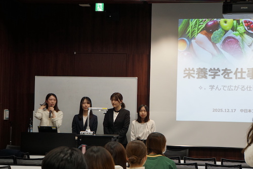 2025年12月17日(水)、経営学部 経営学科 食ビジネスコースでは日本ハムグループの中日本フード株式会社から講師をお招きし、 特別授業(食品開発諭Ⅱ 栄養:担当伴 みずほ准教授)を開講しました。