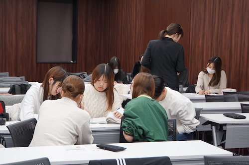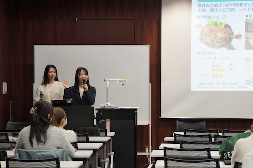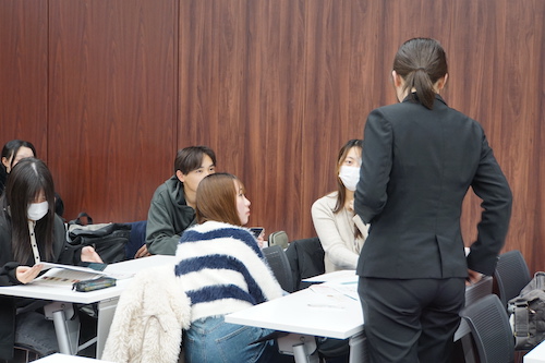 今回は「栄養学を仕事に活かす」というテーマで、経営戦略室マーケティングチームの上原 小春氏(管理栄養士)、関本 葵氏(管理栄養士)に講義していただき、同課で本学食ビジネスコース卒業生の奥 舞雪氏、堀内 悠里氏には、グループワークに参加していただきました。