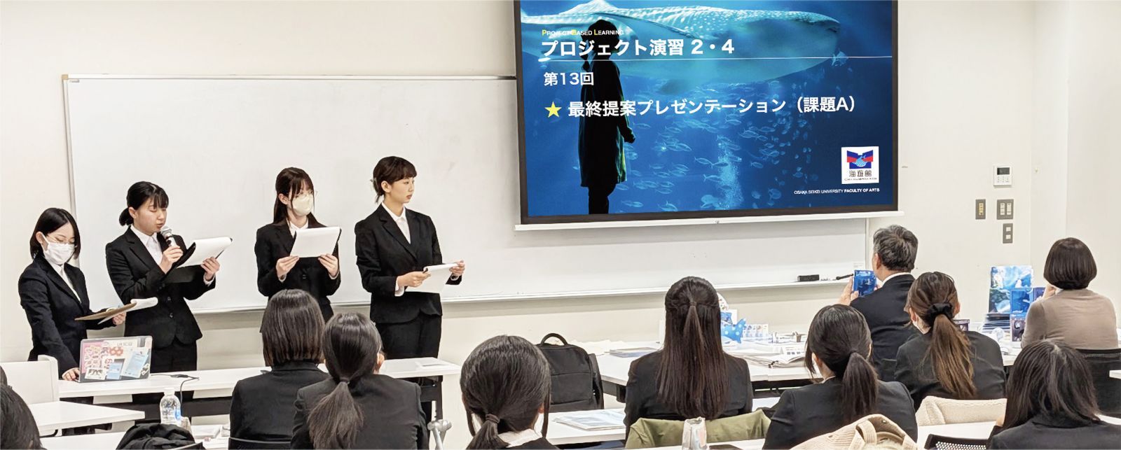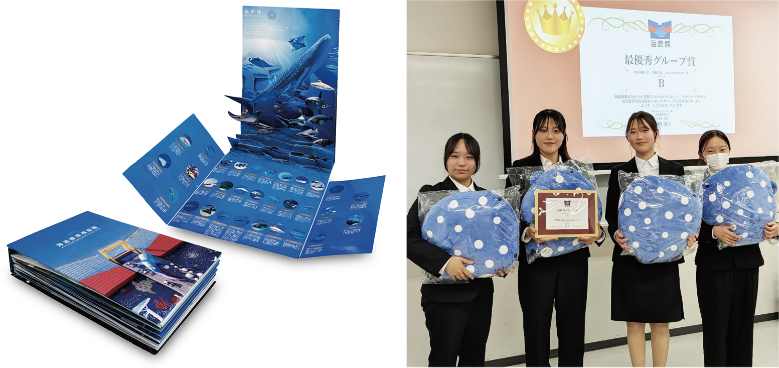 株式会社海遊館からいただいた課題(海遊館オリジナルグッズデザイン)に対して、1月7日(水)に最終提案プレゼンテーションを行い、1月14日(水)授業最終回では、優秀提案に対して企業から表彰を受けました。