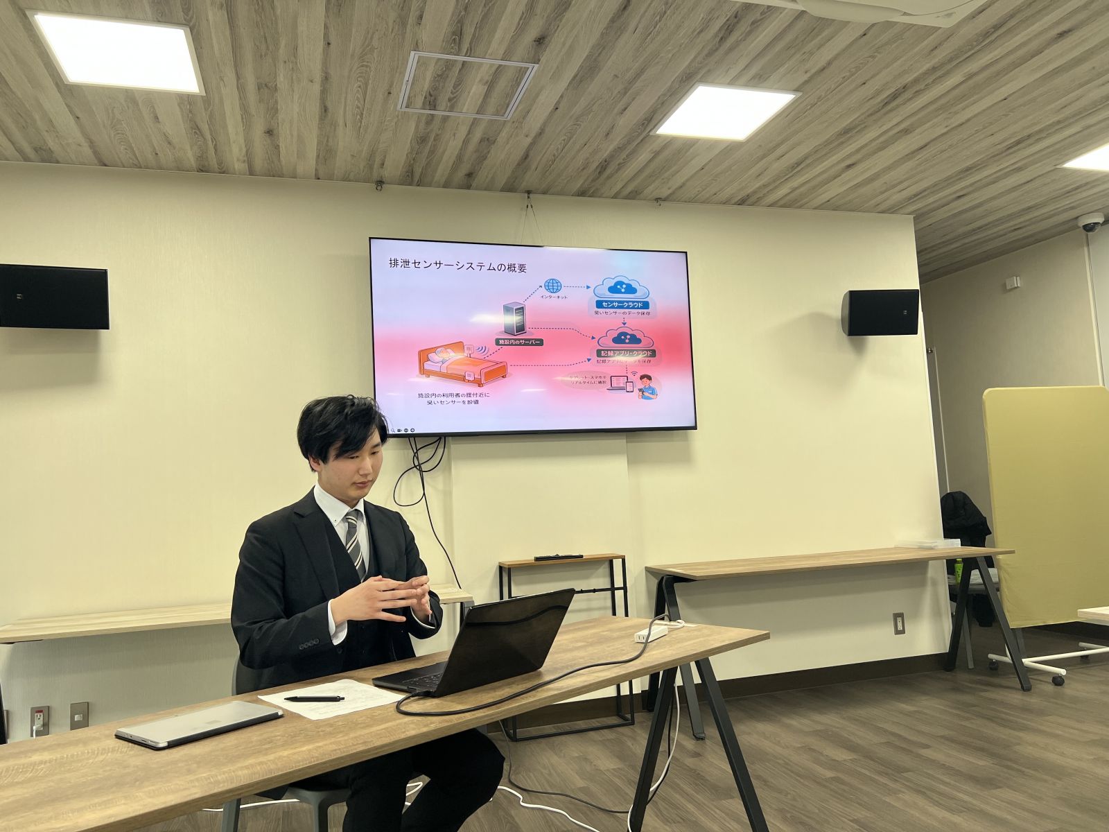 ▲「介護事業者向け排泄検知/記録システム」を提案する学生