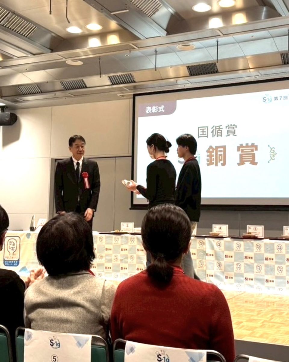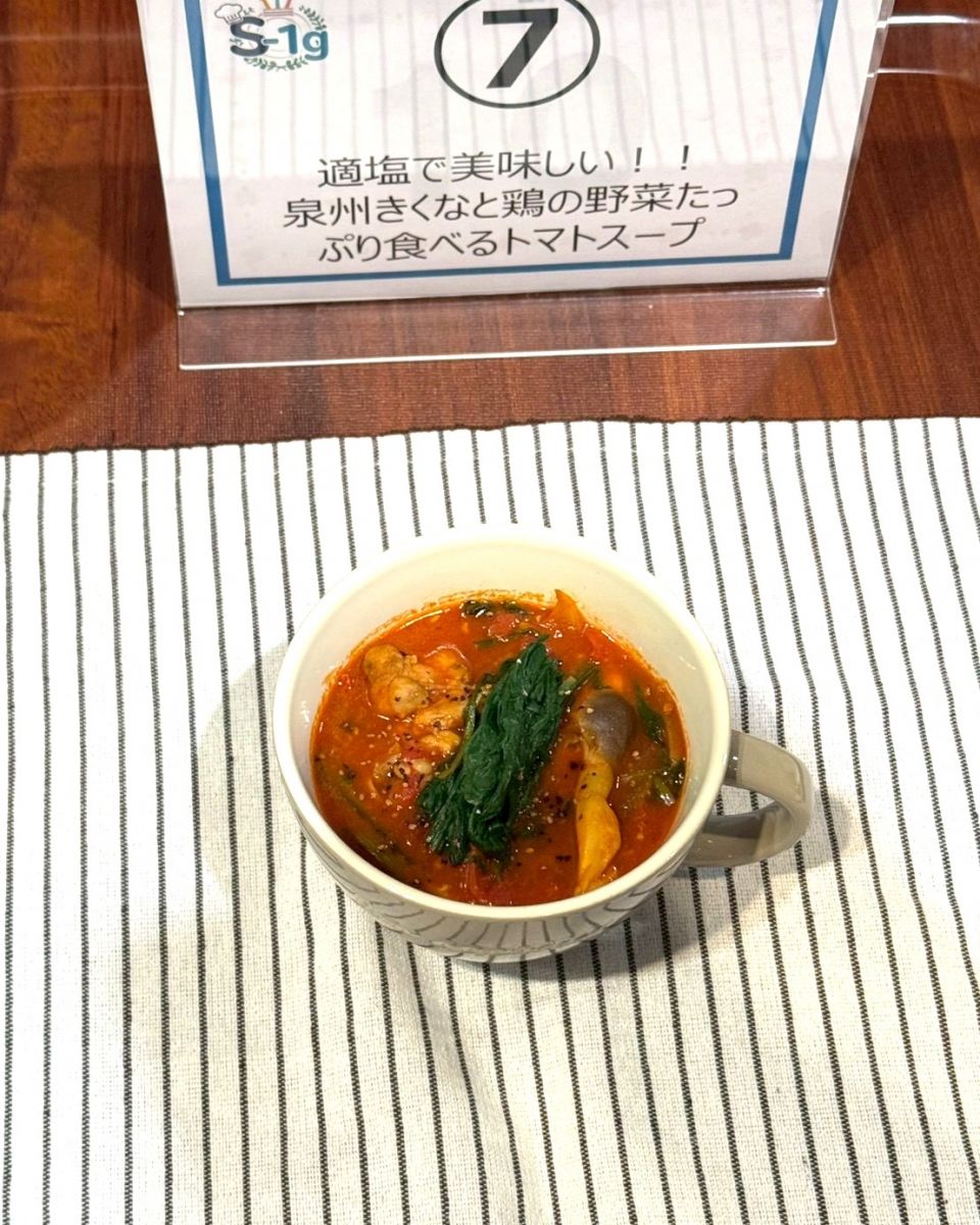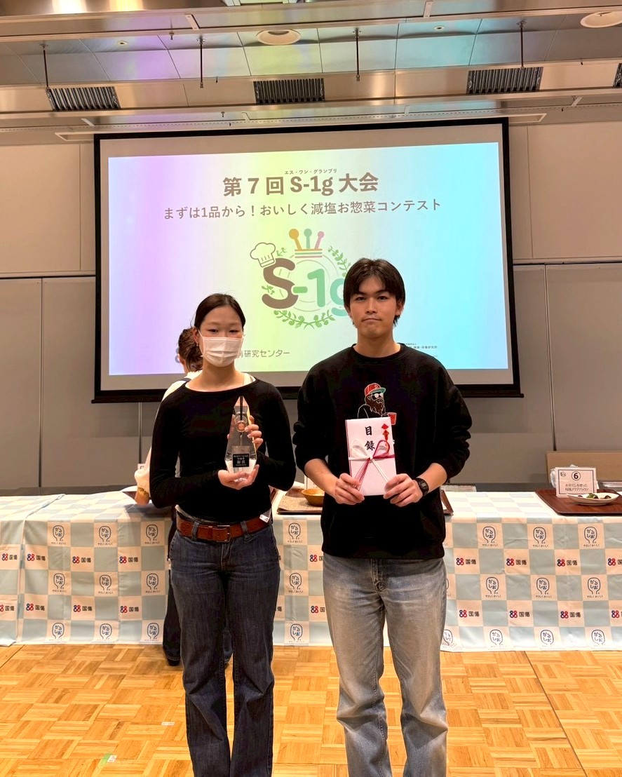 2026年1月31日(土)に開催された国立循環器病研究センター主催の「おいしい減塩レシピコンテスト 第7回S-1g(エス・ワン・グランプリ)大会」にて、経営学部 経営学科 食ビジネスコースの磯貝 笑琉さん(3年)と高田 康生さん(3年)のチームが減塩レシピ『適塩で美味しい!!泉州きくなと鶏の野菜たっぷり食べるトマトスープ』で国循賞の銅賞を受賞しました。