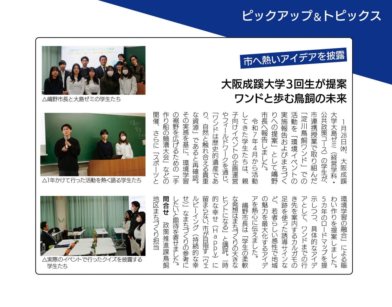 経営学部 経営学科 公共政策コース 大島ゼミの学生が「淀川鳥飼ワンド」での活動を「環境イベントの実施報告およびまちづくりへの提案」として嶋野摂津市長へ報告した連携授業について、摂津市が発行する「広報せっつ(3月号)」に掲載されました。
